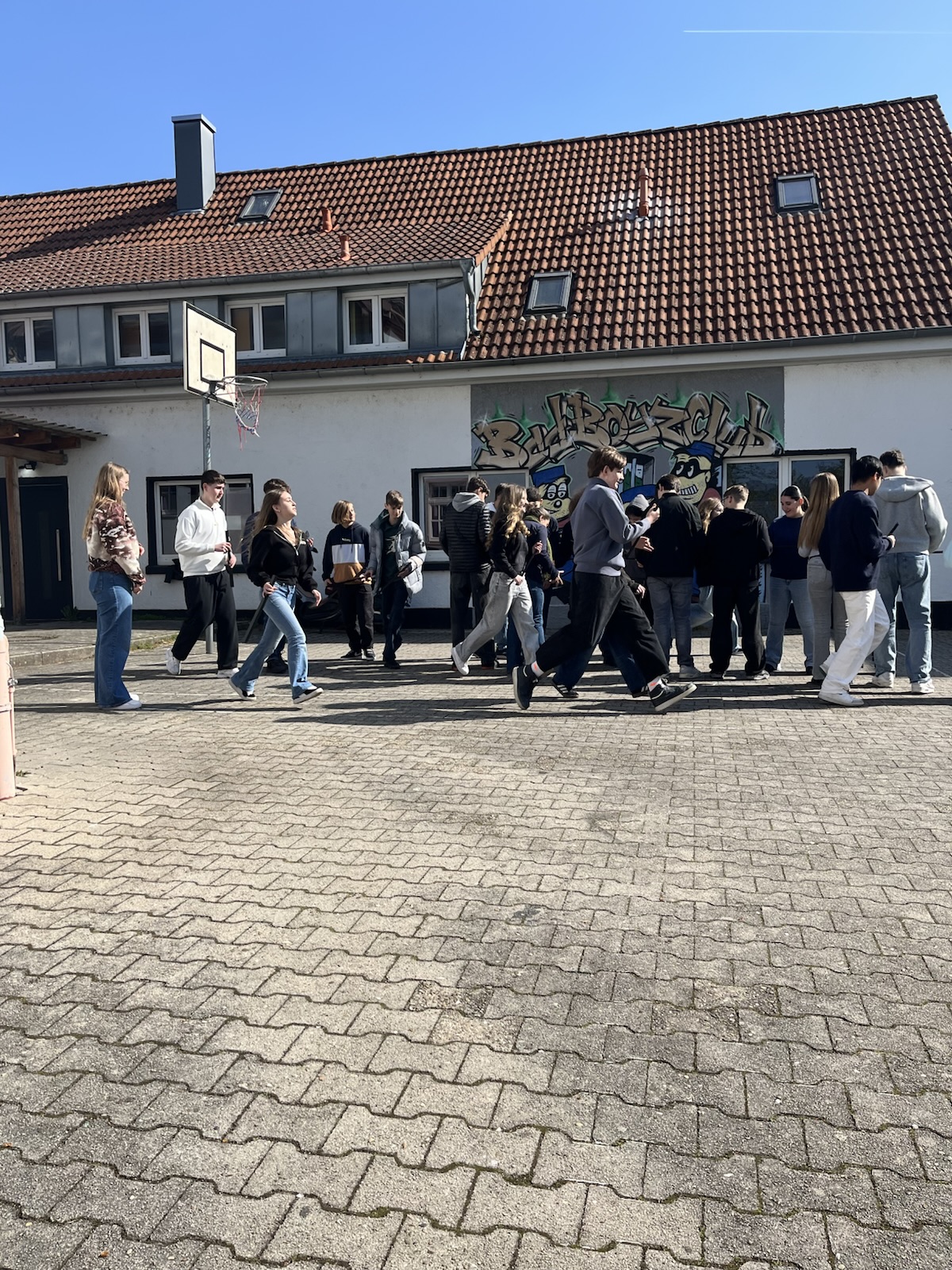 Am 15. April 2026 unternahm die Klasse 8a einen gemeinsamen Ausflug ins JuFaZ zuKindgenau in Gaggenau. Da das ursprünglich geplante Bogenschießen leider wetterbedingt ausfallen musste, haben die beiden Betreuerinnen Elke und Patricia für ein abwechslungsreiches Alternativprogramm gesorgt, das bei allen Schülerinnen und Schülern gut ankam.Verschiedene Teamspiele wie das „Spinnennetz“, Fangen mit Wäscheklammern sowie unterschiedliche Ballspiele sorgten für viel Bewegung, Spaß und Zusammenarbeit.