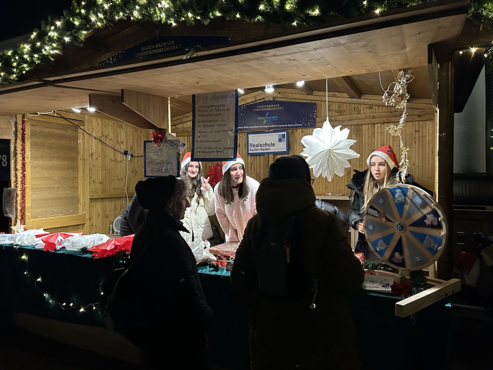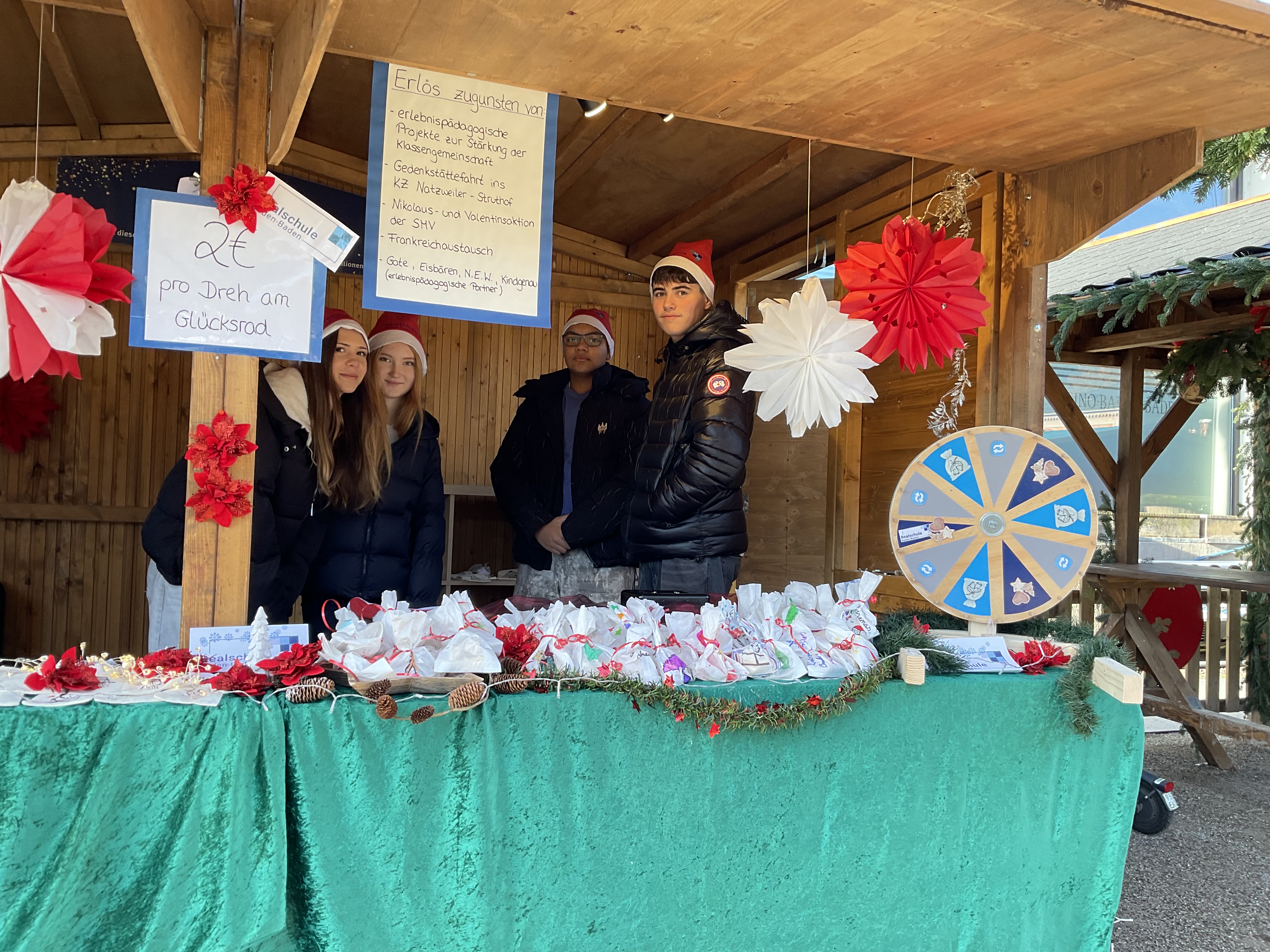 Bei winterlicher Atmosphäre und festlicher Beleuchtung präsentierte sich die Realschule Baden-Baden in diesem Jahr mit einer eigenen Aktion auf dem Baden-Badener Weihnachtsmarkt. Insgesamt 23 engagierte Schülerinnen und Schüler boten in der Stadtwerkehütte selbstgebackene Plätzchen, sowie liebevoll gestaltete Baumwollsäckchen an. In Schichten betreut, entstand so ein stimmungsvoller Stand, der zahlreiche Besucherinnen und Besucher anlockte.